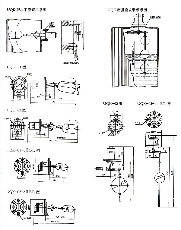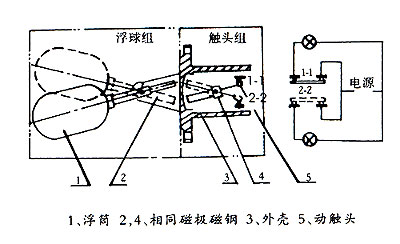 結(jié)構(gòu)原理: UQK型浮球液位控制器由互為隔離的浮球組和觸頭組二大部分組成。 當(dāng)被測液位升高或降低時(shí),浮球1隨之升降,使其端部的磁鋼2上、下擺動(dòng),通過磁力作用,推斥安裝在外殼3內(nèi)相同磁極的磁鋼4上、下擺動(dòng),其另一端的動(dòng)觸點(diǎn)5便在靜觸頭1-1及2-2間連通或斷開。